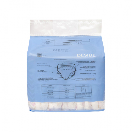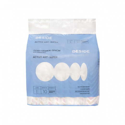 Представлены в размерах M, L и XL в количестве 10 шт в упаковке, а также в 2-х расцветках - "зигзаг" и "перья". Объем впитывания жидкости: M - 1400 мл, L - 1700 мл, XL - 2000 мл. В ассортименте Beside присутствуют одноразовые подгузники на липучках. Продукция торговой марки «Beside» предназначена для адаптации людей с ограниченными возможностями общего бытового назначения. Не является медицинским изделием. BESIDE - когда важно быть рядом!