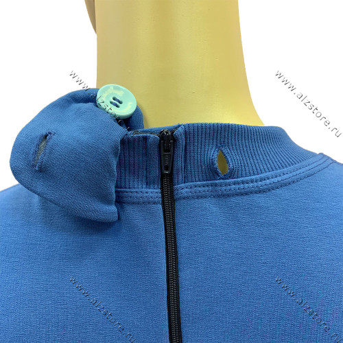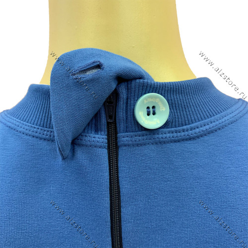 Адаптивный комбинезон Альцфикс снабжён разъемной молнией по шаговому шву для простоты проведения туалета, и дополнительной молнией на спине, от поясницы до ворота. Бегунки обоих молний "прячутся" в специальные клапана, дополнительно застегивающиеся на потайные пуговки, чтобы пациент не смог открыть их самостоятельно. Для ухаживающего же человека это не составит труда.