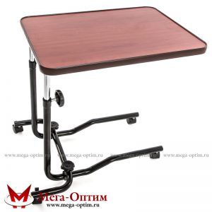 Конструкция столика рассчитана на его приминение над кроватью. Основание стола заезжает под кровать, а столешница располагается сверху над лежащим. Подойдет для ухода за больными в медицинских учреждениях или дома, позволяет с комфортом проводить лечебные процедуры, принимать лекарства и пищу. Столик можно отрегулировать по высоте и углу наклона столешницы с помощью винтов на опорных ногах конструкции.