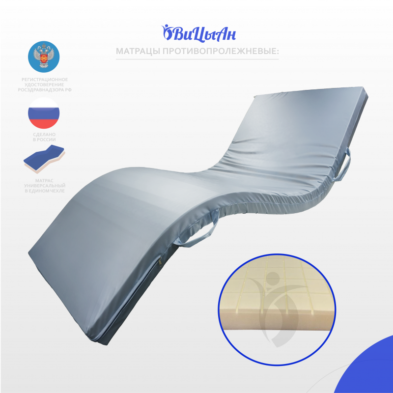 .Показания к применению – необходимость равномерного распределения давления на тело пациента, с целью профилактики образования пролежней у больных с нарушением опорно-двигательного аппарата, для снятия нагрузки на позвоночник.Противопоказания - вытяжение шейные и скелетные, травмы позвоночника и спинного мозга, при наличии открытых пролежней, необходимо проконсультироваться с лечащим врачом. Побочные действия не выявлены.Уникальный фигурный профиль, эффективно распределяют давление тела на поверхности ложа кровати. Влагонепроницаемый съемный чехол матраца изготовлен из мембранной, синтетической ткани (полиэстер 100%) с влагонепроницаемым, паропроницаемым, полиуретановым покрытием плотностью 150 г/м² . На чехле по центру торцевой части вшита молния.1. Благодаря уникальной конструкции матрац оказывает хорошую поддержку тела во время сна и создает все условия для полноценного лечения.2. Ячейки наполнителя не слипаются, независимые конусы даже при максимальой нагрузке на них оставляют между собой воздушные каналы, создавая вентиляцию, что значительно увеличивает срок эксплуатации.3. Съемный чехол легко снимается, поэтому осуществлять надлежащий уход и своевременную обработку, дезинфекцию, стирку и сушку (в зависимости от загрязнения) матраса можно многократно. 4. Не имеет швов на рабочей поверхности5. Молния защищена влагонепроницаемым клапаном6. Благодаря водонепроницаемому покрытию, жидкость с поверхности чехла легко удаляется и не проникает во внутрь изделия.7. Специальная антибактериальная обработка, защищает от распространения бактерий.8. Эластичность чехла позволяет не вызывает ответного давления и способствует равномерному распределению массы тела на поверхности ложа.9. Антискользящая поверхность препятствует скатыванию