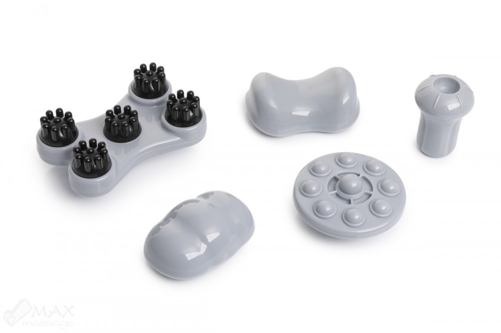 В комплект к аппарату входят 5 сменных насадок, которые предназначены для разных участков тела и множества приёмов массажа. В их число входят: