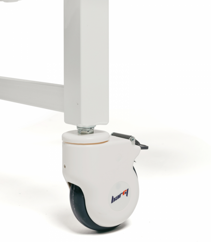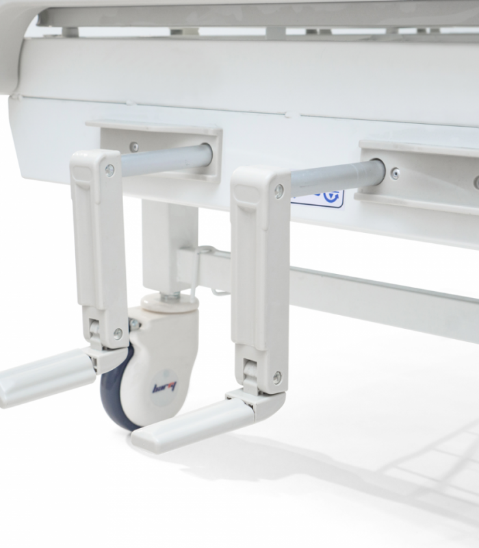 Боковые ограждения защищают пациента от падения, легко складываются и при необходимости снимаются для проведения гигиенических или иных мероприятий. Колеса самоуправляемые с индивидуальным тормозным механизмом, что позволяет перемещать кровать в закрытом помещении и фиксировать ее в любом необходимом положении.