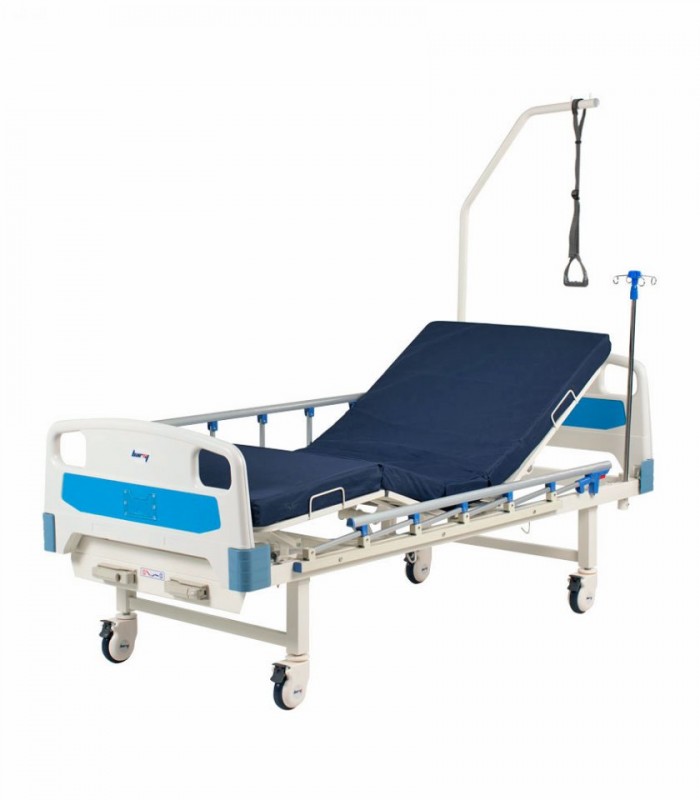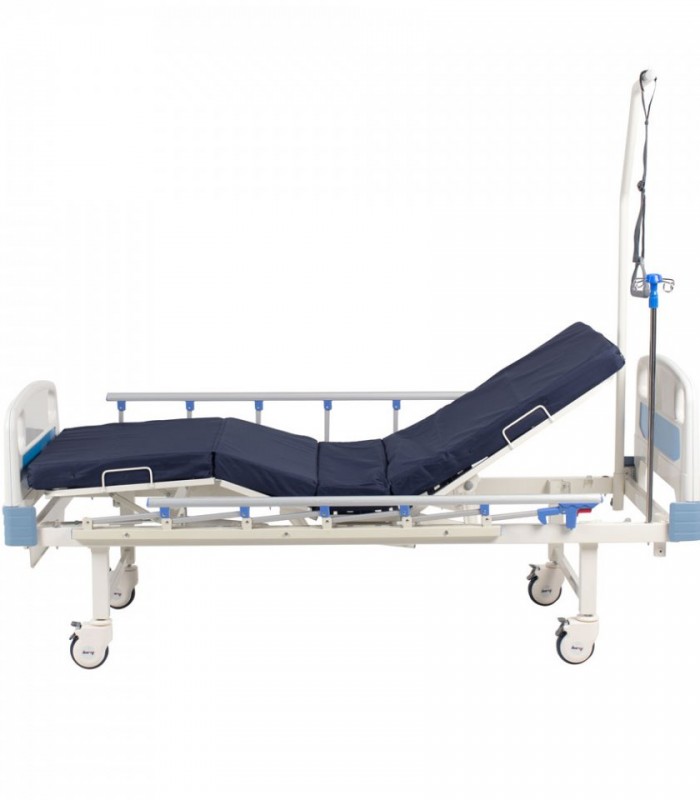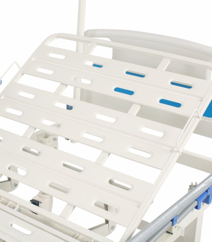 Кровать имеет две ручки управления для регулировки углов наклона спинной и тазобедренной секций. Основа рама кровати изготовлена из стали и покрыта высококачественным порошковым покрытием, что обеспечивает качественную и долгосрочную защиту от внешних воздействий, а также устойчивость к дезинфицирующим средствам.
