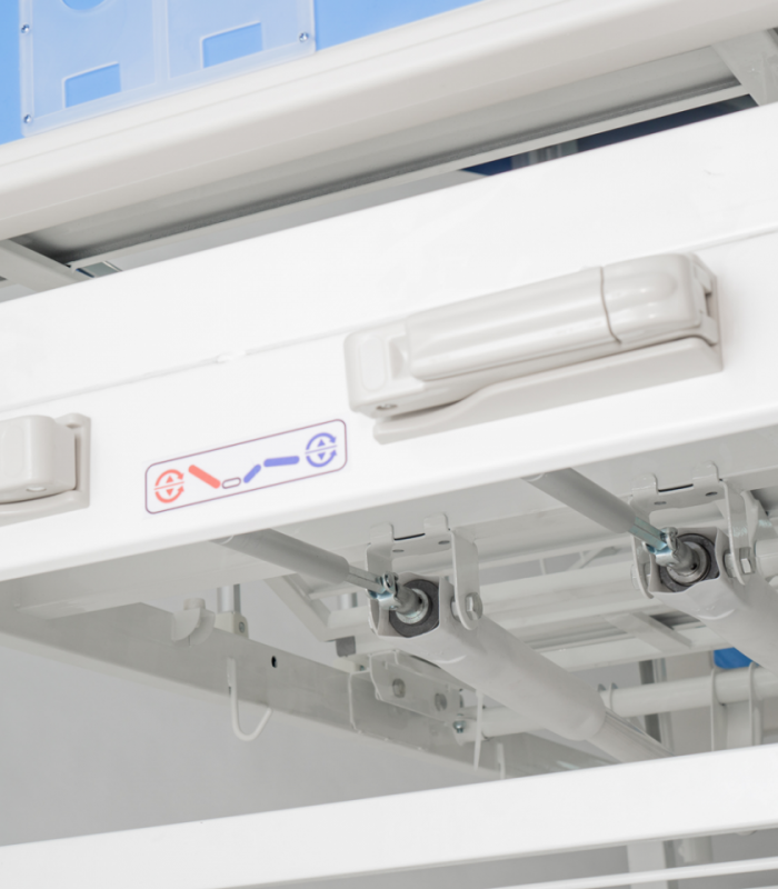 Панели изголовья и изножья изготовлены из высококачественного ударопрочного пластика ABS. Глянцевая поверхность позволяет быстро и эффективно проводить дезинфекцию. Панели легко снимаются, что позволяет персоналу легче выполнять специальные медицинские и реанимационные процедуры.