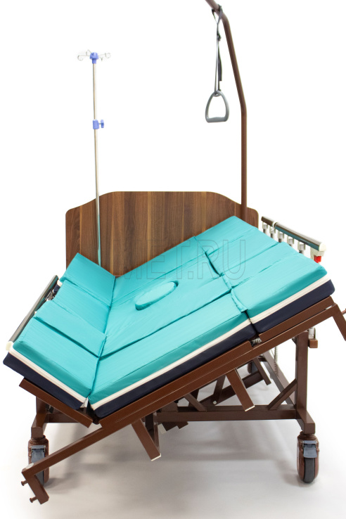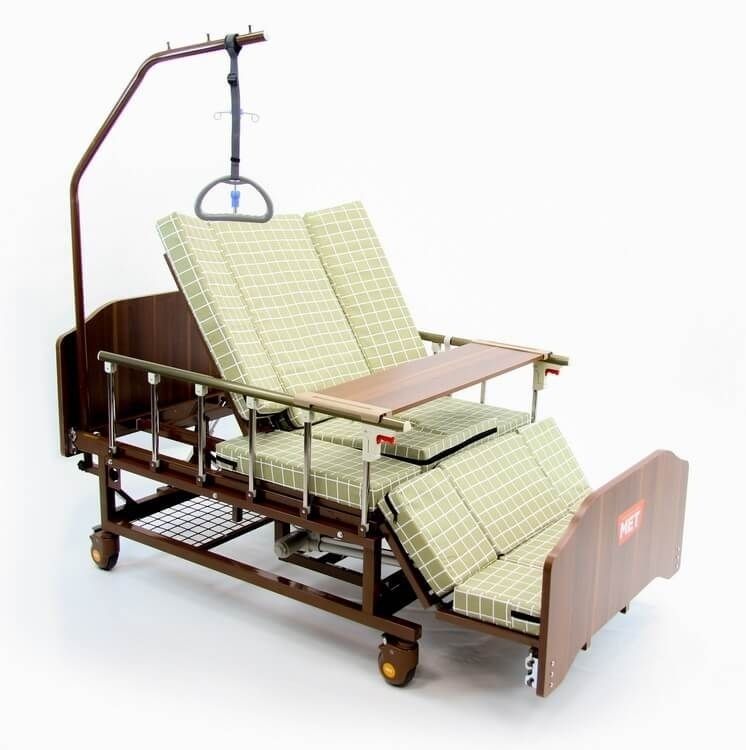 Медицинская кровать с механизмом переворачивания, снабжённым таймером и позволяющим ночную смену положения больного без контроля ухаживающего лица, полноценным положением кардио-кресло, опускающим все ножные сегменты к полу и электроприводным санитарным оснащением, которое при определённой сохранности моторных функций пациента обеспечит ему максимальную автономность. без, в любом случае, действующей на нервы помощи ухаживающих лиц.