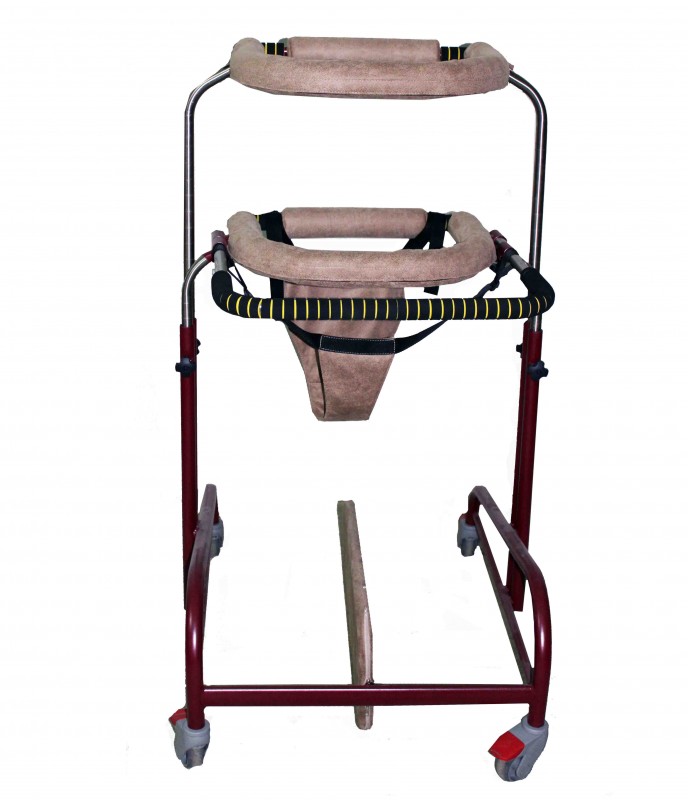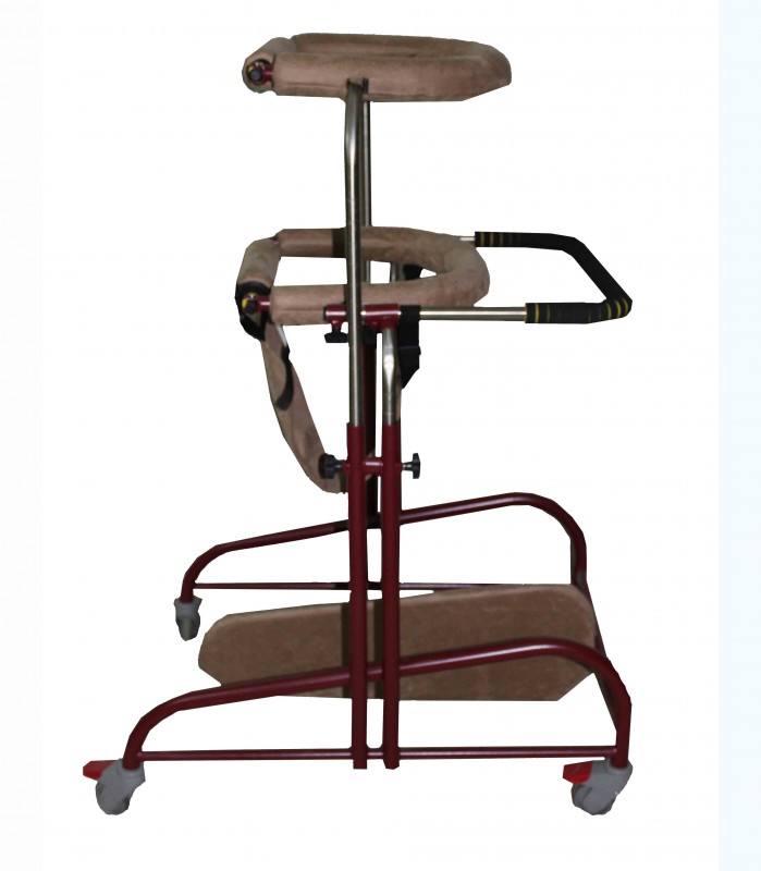 Ходунки с двумя уровнями поддержки - грудной и бедренной обоймами, с большими поворотными колесами, со стояночными тормозами, разделителем для ног и мягкими поддерживающими трусиками.