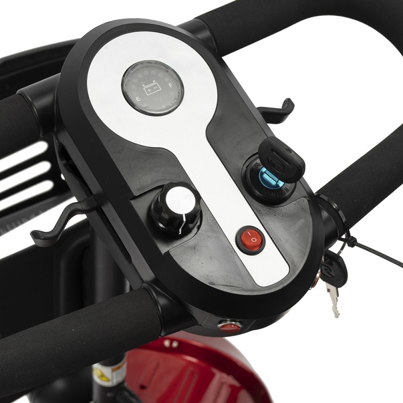 Оснащен удобным рулем, на котором располагается панель управления, и поворотным сиденьем с откидывающимися подлокотниками. Это позволяет сделать посадку на кресло скутера комфортной даже для пользователей, которые имеют проблемы с опорно-двигательным аппаратом.