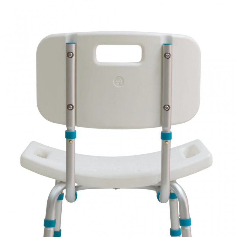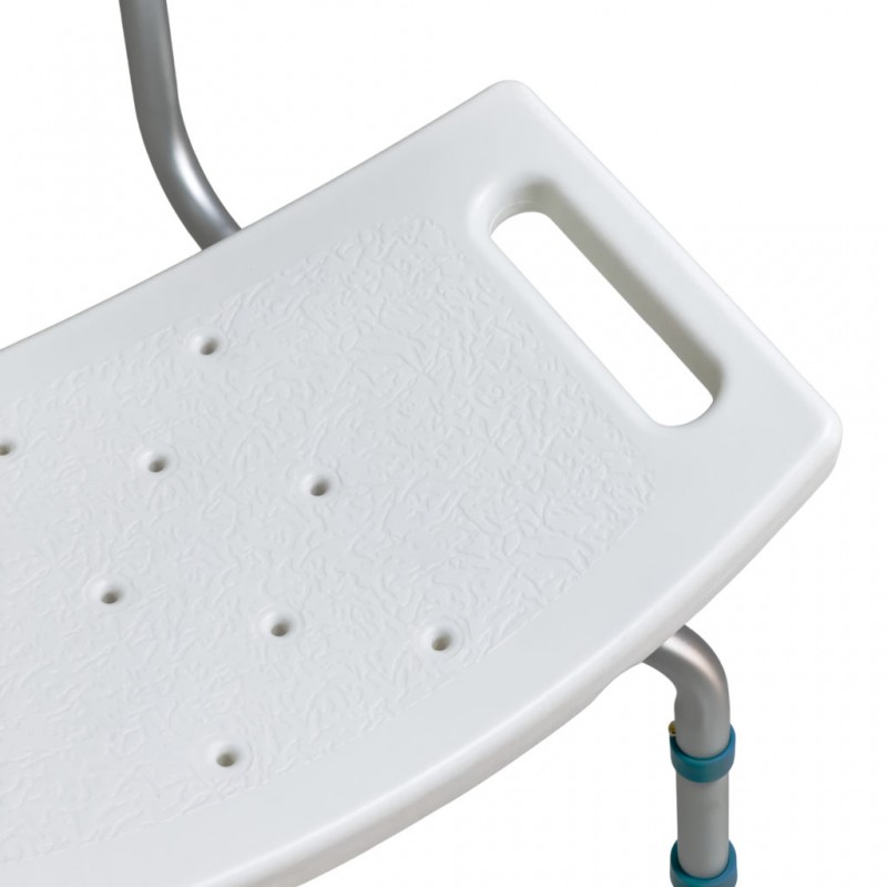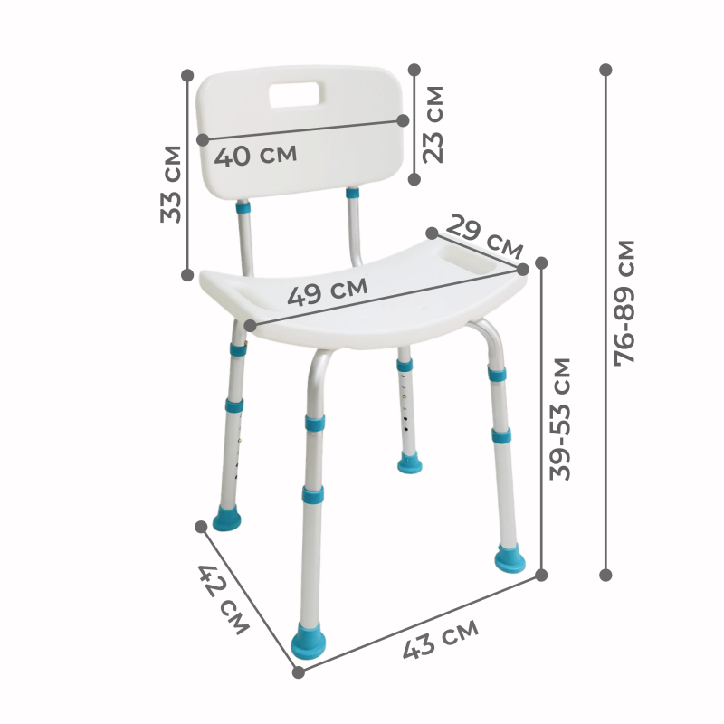 Конструкция стула выполнена из прочного алюминиевого каркаса, устойчивого к влаге и коррозии. Сиденье и спинка изготовлены из нескользящего пластика с дренажными отверстиями для быстрого стока воды. Высота ножек регулируется, что позволяет адаптировать изделие под индивидуальные потребности пользователя. Резиновые наконечники обеспечивают надежное сцепление с поверхностью, предотвращая скольжение. Стул лёгкий, устойчивый и прост в уходе — идеальный помощник для ежедневного использования в ванной комнате.